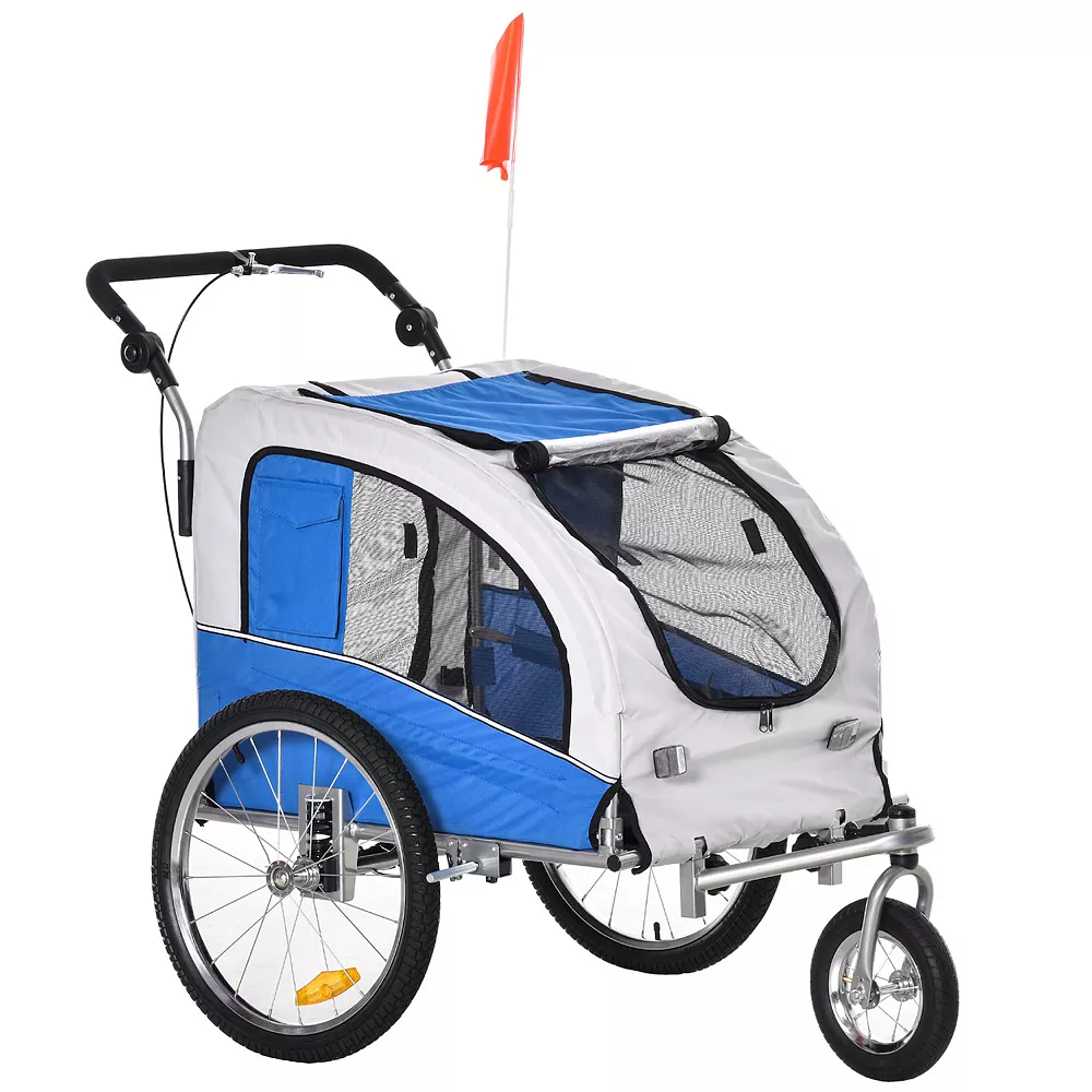 The 2-in-1 design make it can be used as both a pet trailer and a pet stroller. Two 20 rear wheels and a 360 swivel front wheel provide a smooth ride. And two entrances for maximum convenience getting your pet in and out. The front door features a mesh door for ventilation and a canopy for windproof. The pet bike trailer has a D-ring and security leash included inside to keep your pet secure during their ride.