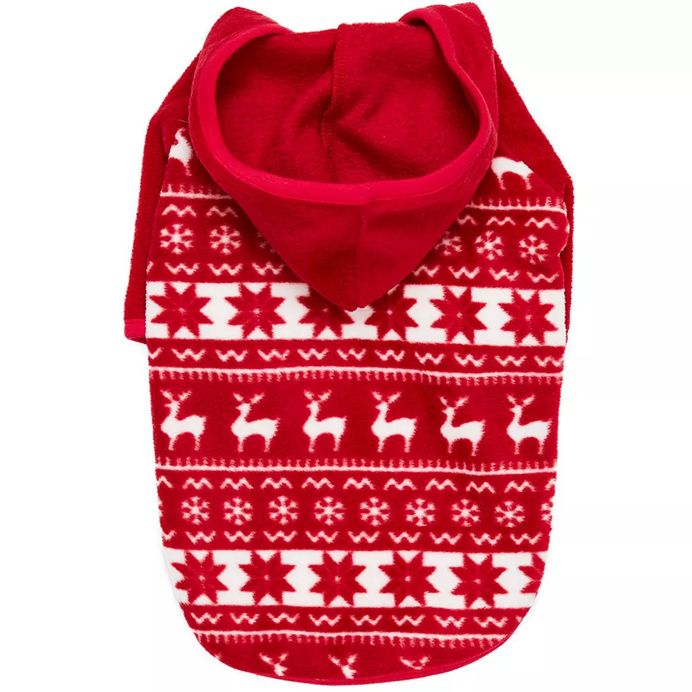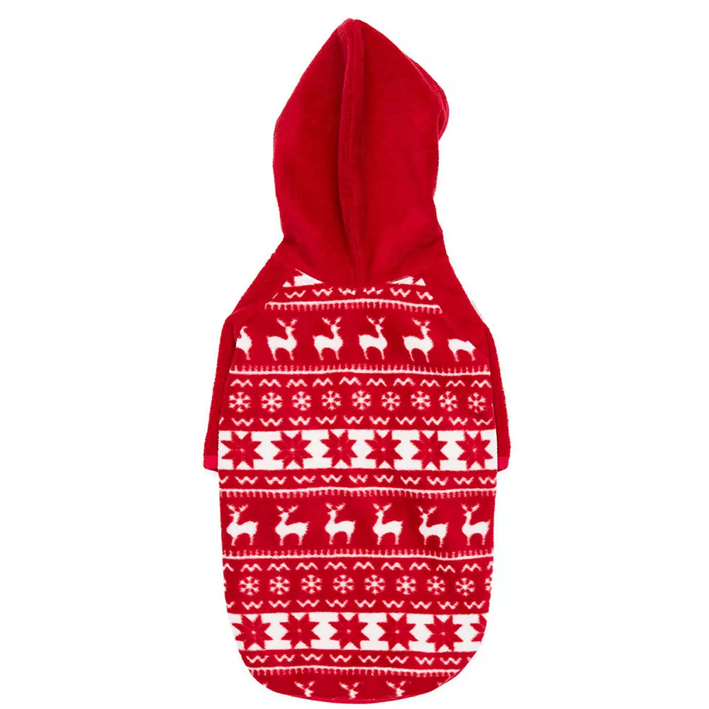 Keep your pup comfy with this Blueberry Pet Christmas Reindeer & Snowflake Fleece Hooded Dog Sweater.