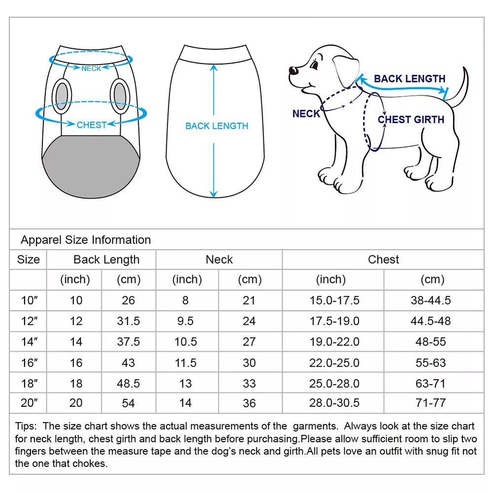 - XXL: Back Length 20″, Chest Girth 28″- 30.5″, Neck 14″