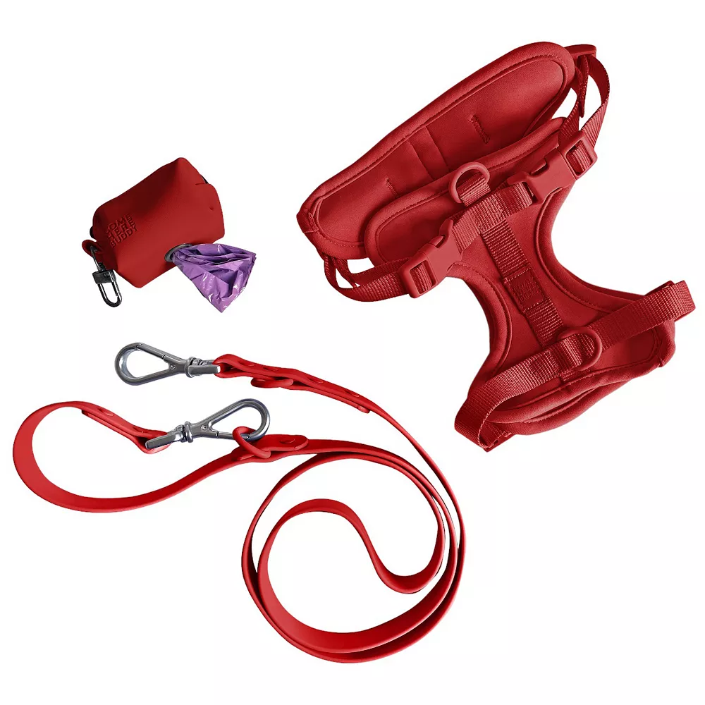The Walk Set comes with our super comfortable, lightweight dog Harness, our dirt-resistant, water-proof Leash, and our color-matched Dog Waste Bag Dispenser — the perfect dispenser for our resin poop bags.