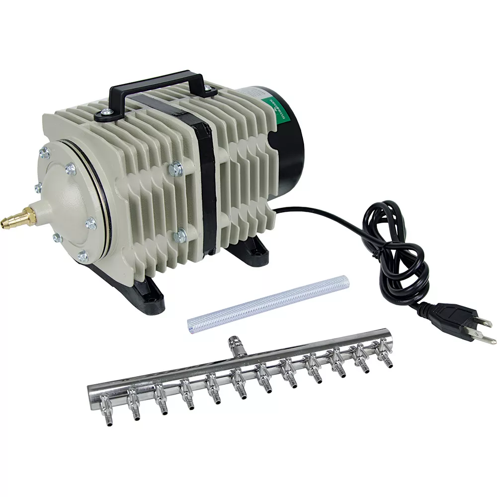 The AAPA110L Commercial Pond Air Pump comes in at 112 watts, can pump up to 110 Liters per minute, and has a total of 12 outlets. The Active Aqua Hydrofarm AAPA110L 112 Watt Commercial Air Pump is an ideal choice for pond and growing projects that need a powerful energy source to keep running and thriving efficiently for long periods of time.