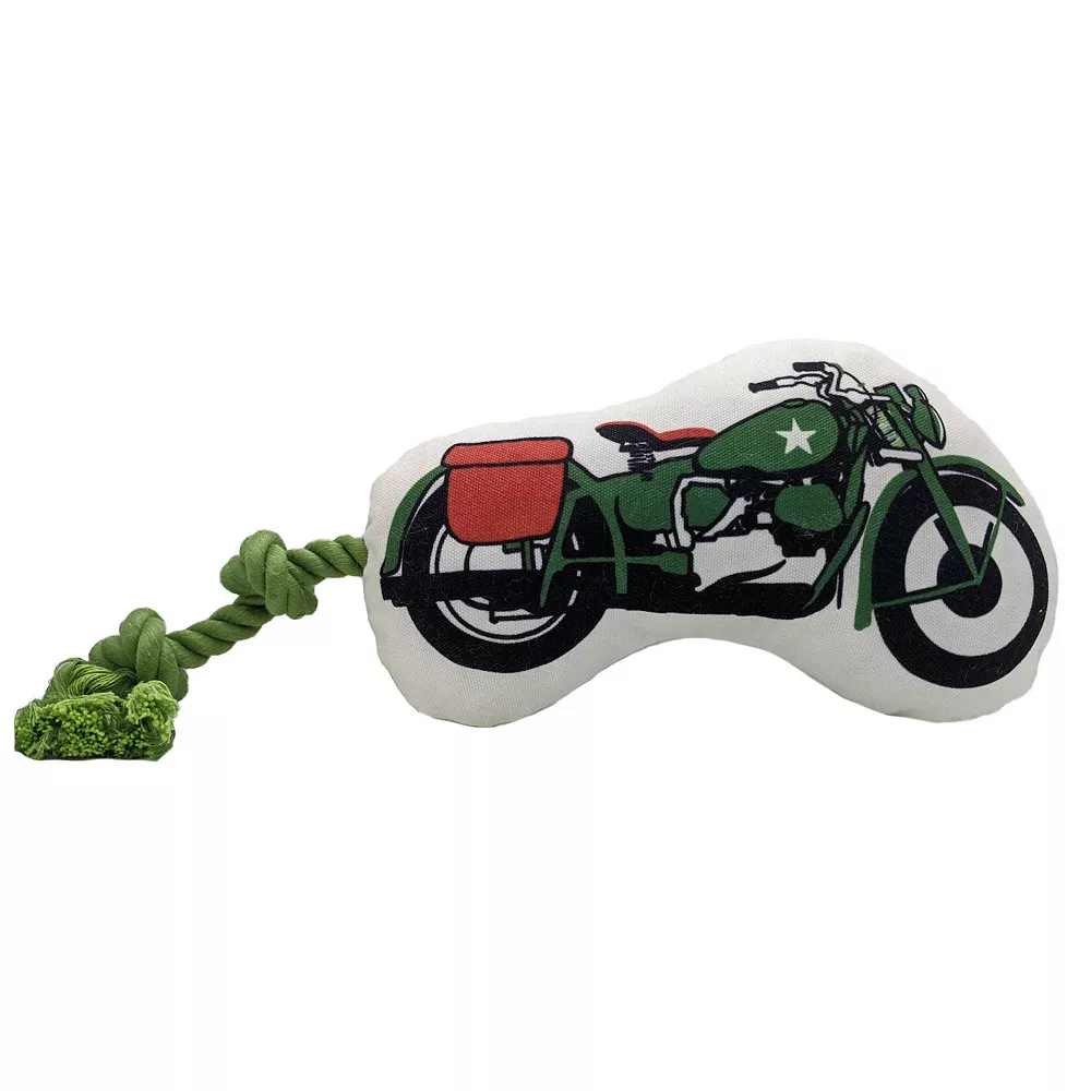 That’s a direct order, pup! This Motorcycle retro action toy features custom graphics inspired by WW2 army surplus stores. The front side is made of durable canvas with a digital print of non-toxic ink, while the backside is soft fleece for comfort and cuddles.