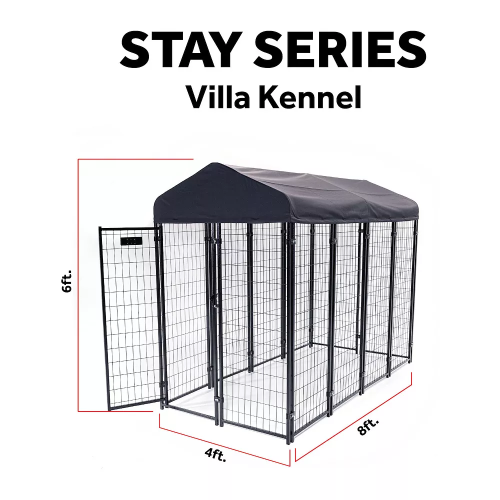 Easily keep your pup’s home clean by simply removing the roof cover and by wiping off any dirt or debris. This villa dog kennel features a straightforward, no tool assembly so that you have more time to play with your family pet. Measuring 4 x 8 x 6-foot with a door opening of 18.5 x 52.5 inches this kennel has ideal space for your dog.