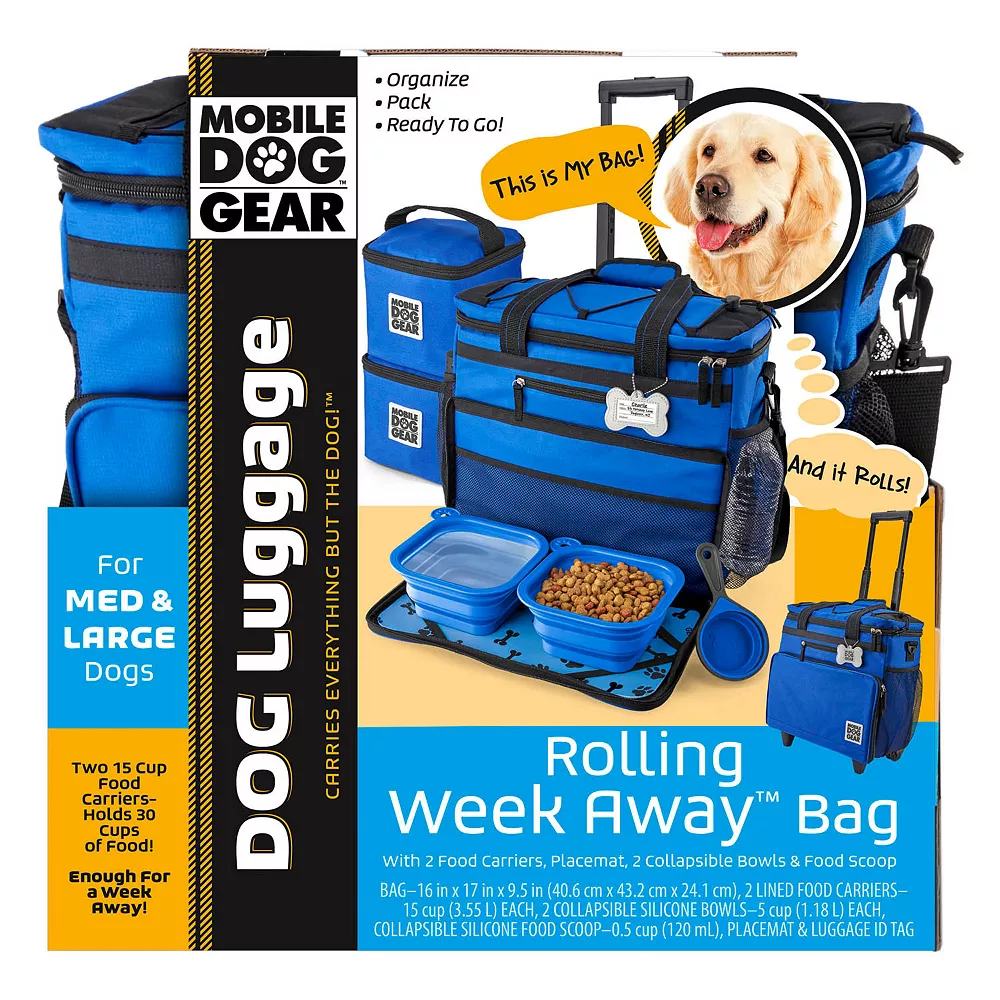 Mobile Dog Gear organized luggage dog travel bags makes it simple to travel with your dog. The Rolling Week Away Bag is the perfect size for packing your pet’s belongings for an entire week or longer!