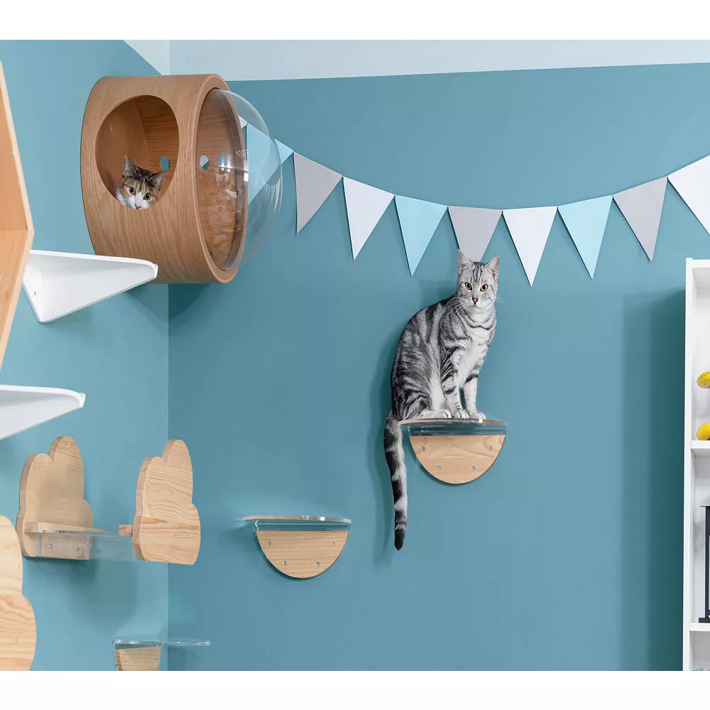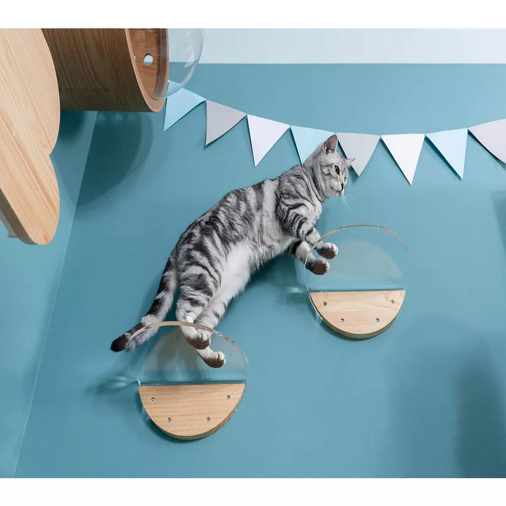 We know cats love perching up high and want to create a perfect vantage point for them. The round clear Lack is a wall-mounted cat shelves which create a vertical space. It allows your cats to explore and lounge up high, which cats love. Moreover saving space of your apartments when you don’t want to take up valuable floor space. With a transparent board, the round clear Lack allows cat to see what happened below from above. It also allows us to see the cat’s lovely paw from below. On the production method, we abandon the past which use brackets to strengthen the shelve and carry weight from cat. We use bentwood to make the Lack not just look beauty but safety. To catify your house, LACK cat shelves makes it simpler. Wooden Cat Friendly Furniture, Truly Cater to Your Cat’s Needs. Easily Build The Cat Wall In Your Home With MYZOO Products. A Cat Step Fun For All Ages.