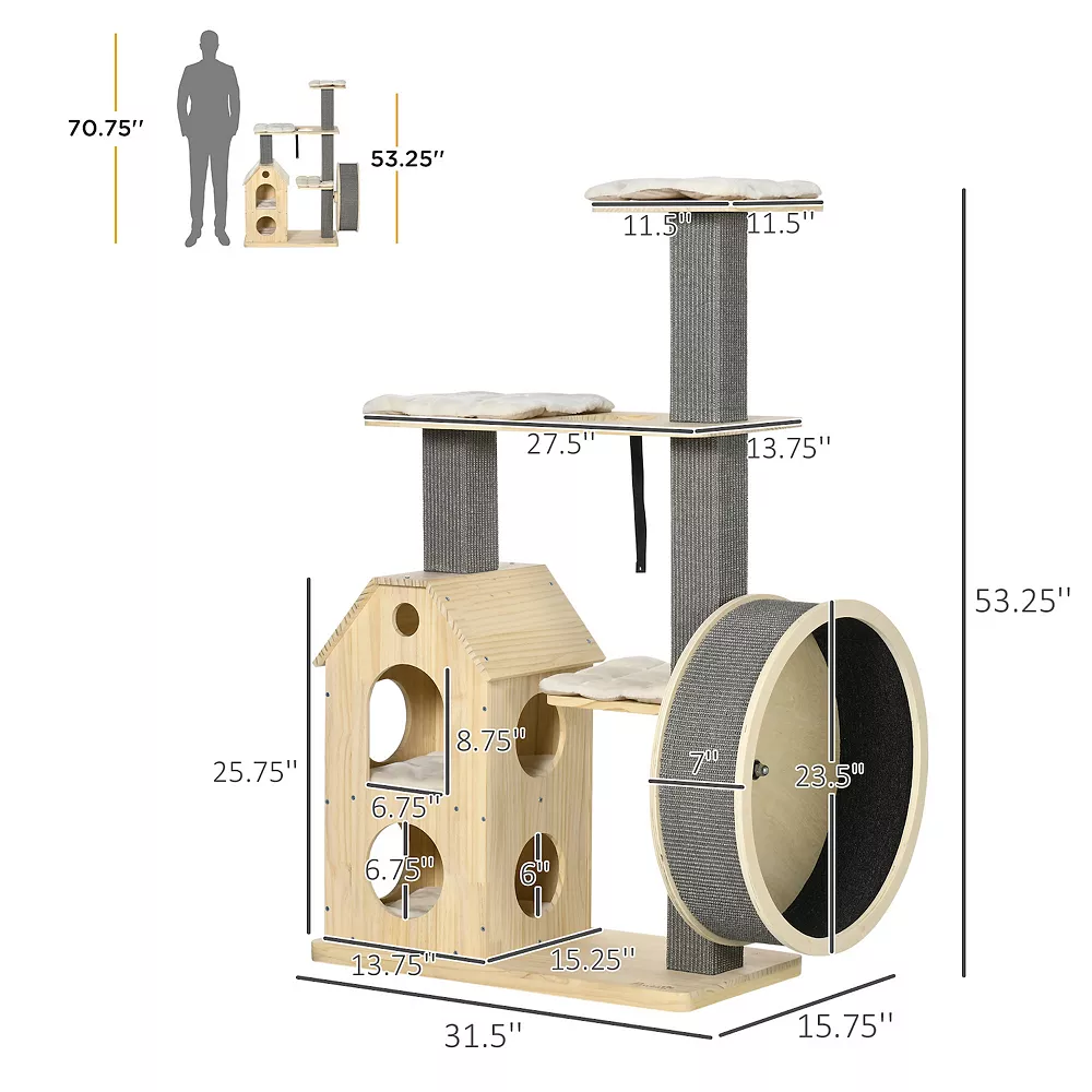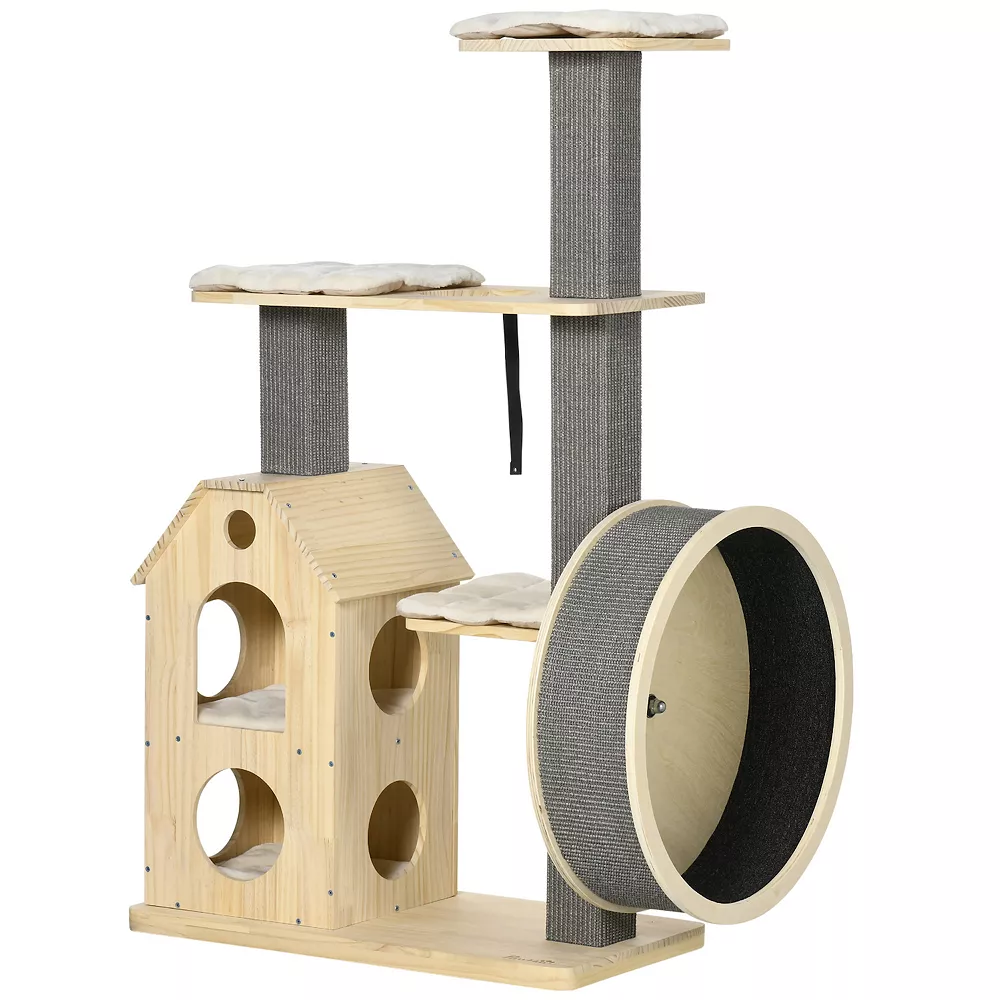 - Two-Cat House, Tree & Wheel: Our cat tower features a double-decker house with two beds that are soft and washable. Perfect for a two-cat household, six holes make it so cats can have numerous places to stick their paws through, and an exercise wheel offers energetic cats a way to get out some energy.