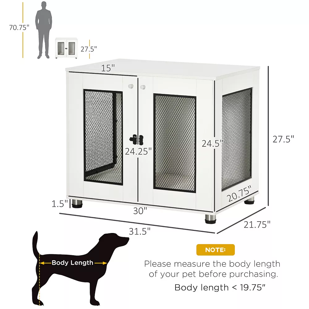 - Dog Kennel Furniture Information: Overall Dimensions: 31.5″ W x 21.75″ D x 27.5″ H. Interior Dimensions: 30″ W x 20.75″ D x 24.5″ H. Double Door Dimensions (Single): 15″ W x 24.25″ H. Suitable for Medium Dogs Up to 44 lbs., 19.75″ in Body Length. Assembly Required.
