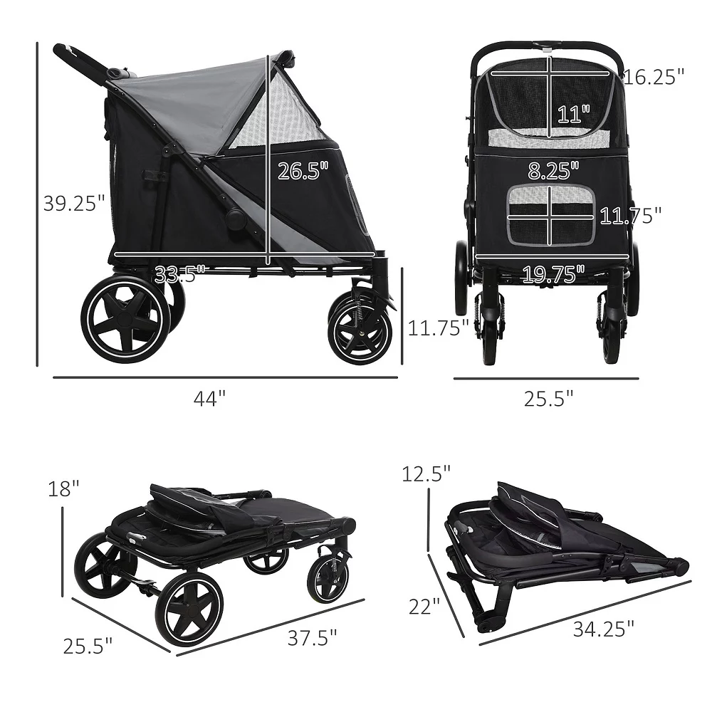 - Travel Stroller Info: Overall Dimensions: 44″ L x 25.5″ W x 39.25″ H. Suitable for Large & Medium-Sized Dogs Less than 23.5″ in Length and Less than 66 lbs. in Weight.