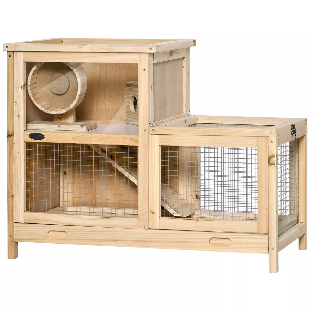 This PawHut hamster cage is the ultimate playground for your small pets to have. This 2 tiers hamster house offers plenty of room, provides seesaw, running wheel, hut and ladder. Includes a bottom tray, it is convenient for you to clean. The front of the hamster cage for syrian hamster has a glass window for viewing. You can place it anywhere and your little hamsters will have an instant home. The whole unit sits above the floor and is an overall great home for your pets.