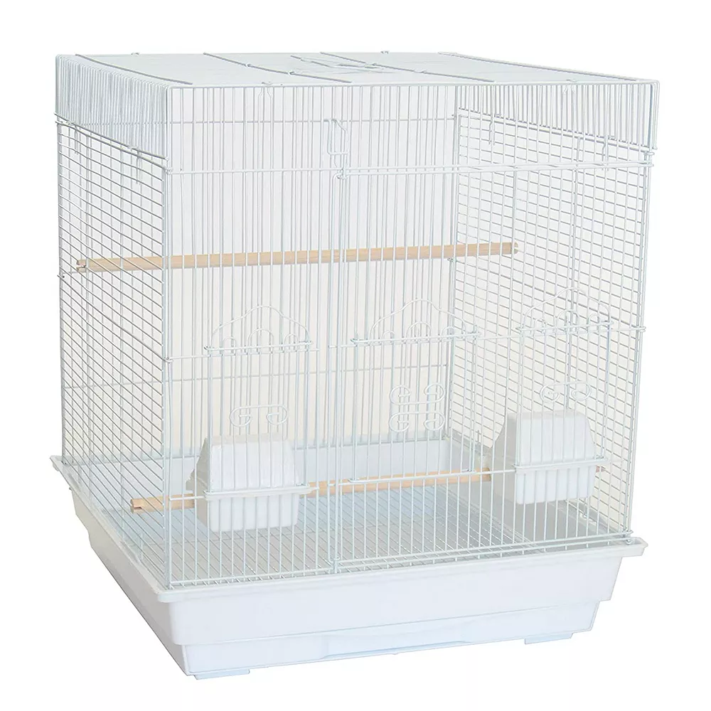 3/8 bar spacing square top small Bird Cage – 18×14 in White. It has large swing out door with door pin and small lift up door, 2 feeder doors and 2 cups, 2 Perches, easy clean removable metal grate and slide out bottom plastic tray.