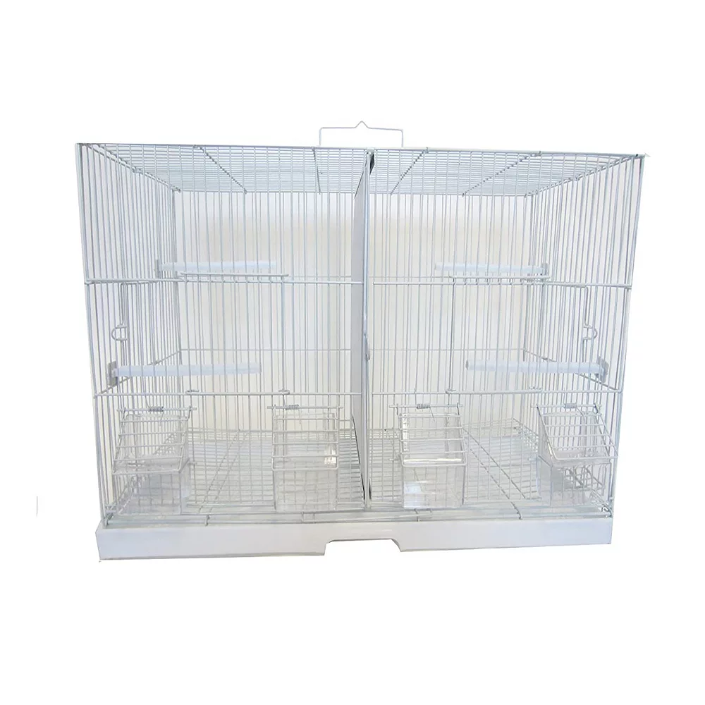 3/8 bar spacing canary finch breeding cage in White. It has removable wire & solid plastic divider, nest box door on both sides and 2 lift up front doors, 4 perches and spring loaded feed doors with 4 cup, easy clean removable metal grate and slide out bottom plastic tray. The cage dimension is 23.5Lx10.5Dx15.5H.