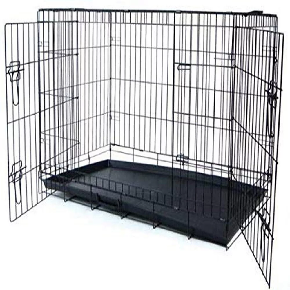 Two Doors (side and front)foldable dog crate in Black is easy to setup without tool. It is heavy duty wire gauge 6 for Horizontal and gauge 11 for Veritical with Bar Spacing 1.5 and has No Bottom Grate. It also come with 1 Free divider and Color Box