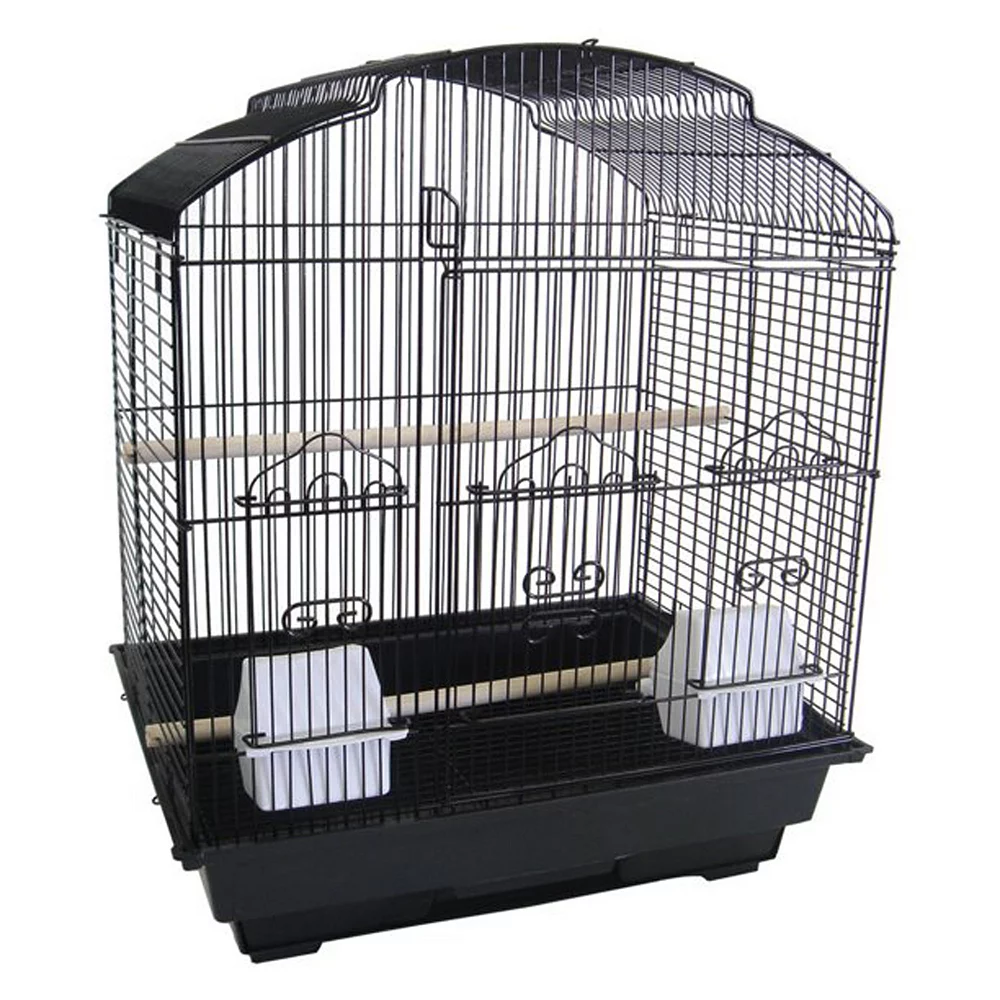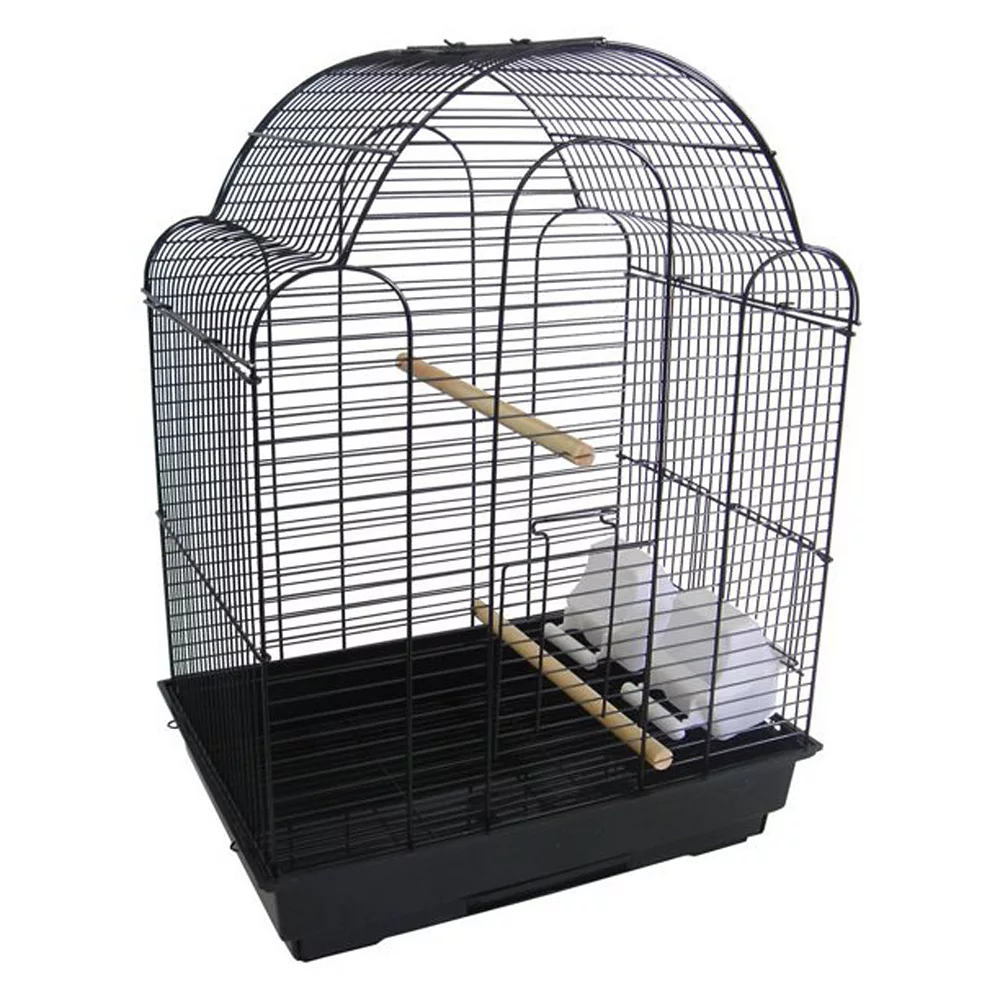 3/8 bar spacing shell top small Bird Cage – 18×14 in Black. It has large swing out door with door pin and small lift up door, 2 feeder doors and 2 cups, 2 Perches, easy clean removable metal grate and slide out bottom plastic tray. Dimension for cage only is 18L x 14D x 22H