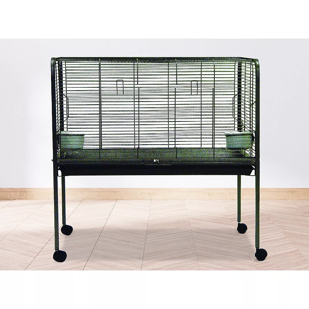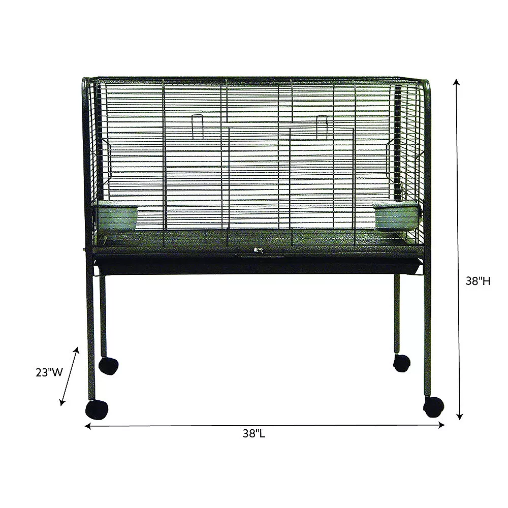 Small animal rabbit cage on stand in Antique Silver has pull down front door, 2 heavy duty ABS cups, 2 feeder doors with drop pin, easy clean removable metal grate and slide out bottom plastic tray, heavy duty caster and 1/2 Floor Grate. The Dimension for the whole cage is 38L x 23D x 38H inches and cage only is 38Lx23Dx19H inches.