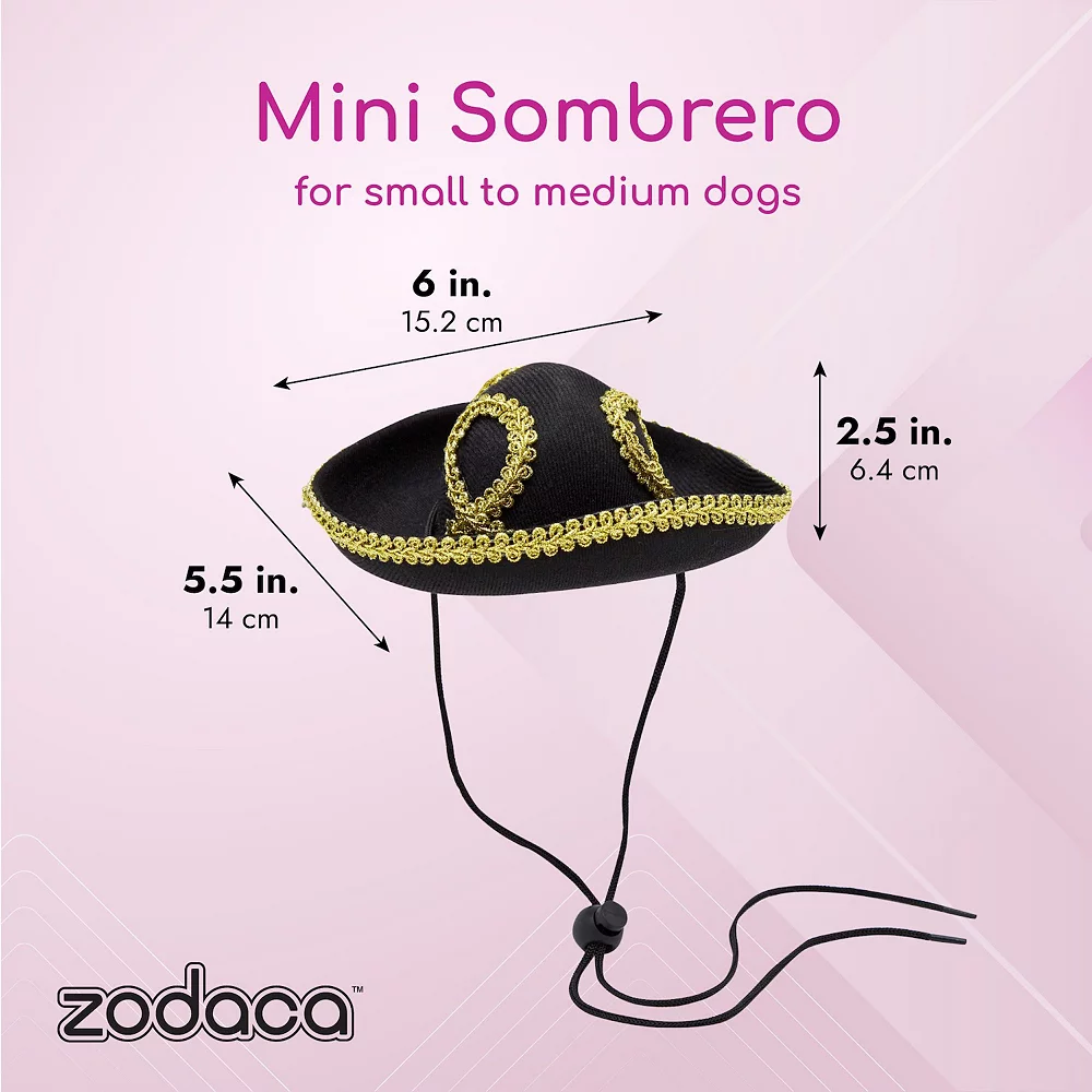 - Dog Sombrero: This small dog sombrero comes in black with gold detailing and an elastic band to secure around your pets head